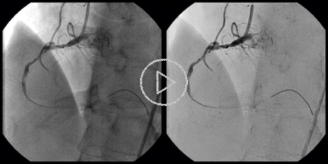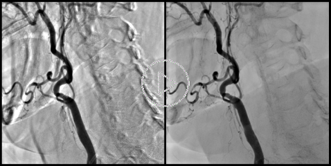 Motion Compensated DSA essentially uses the same algorithms as the Cardiac DSA. Elastic registration of the subtraction mask allows for substantial reduction of motion artifacts. The images on the left show a comparison between the "classic" (rigid) DSA without motion compensation (left image) and the Motion Compensated DSA (right image). Both images were produced with suppression of the "background" anatomy set to 75%.